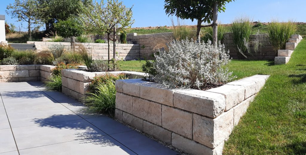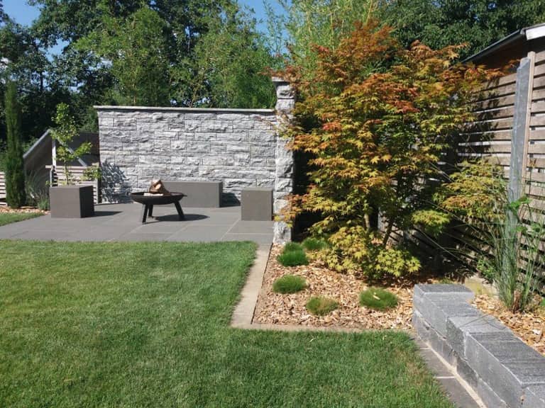 Die künftige Sitzecke mit Feuerstelle umgibt eine Natursteinmauer aus Biasca Gneis, Großformat – Bodenplatten aus Basalt sowie Sitzgelegenheiten aus Basalt-Massivblöcken laden zum verweilen ein.